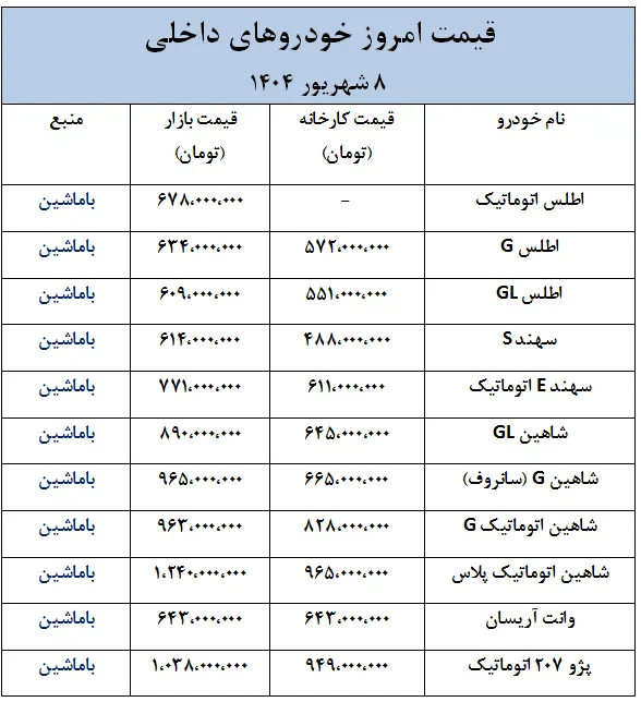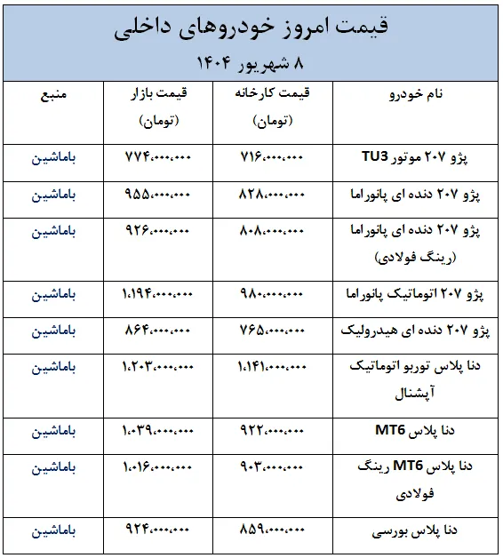 بر اساس گزارشهای اخیر، قیمت خودروهای داخلی امروز (8 شهریور 1404) از 453 میلیون تومان برای پراید 151 تا بیش از 1.7 میلیارد تومان برای برخی مدلهای مونتاژی و وارداتی متغیر است،