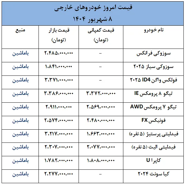 در ادامه، قیمت امروز خودروهای داخلی و خارجی در قالب جدول ارائه شده است.