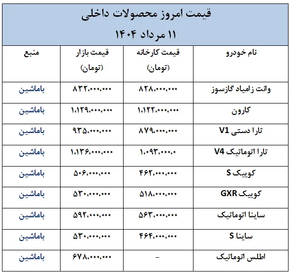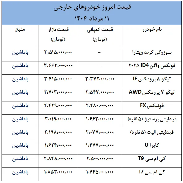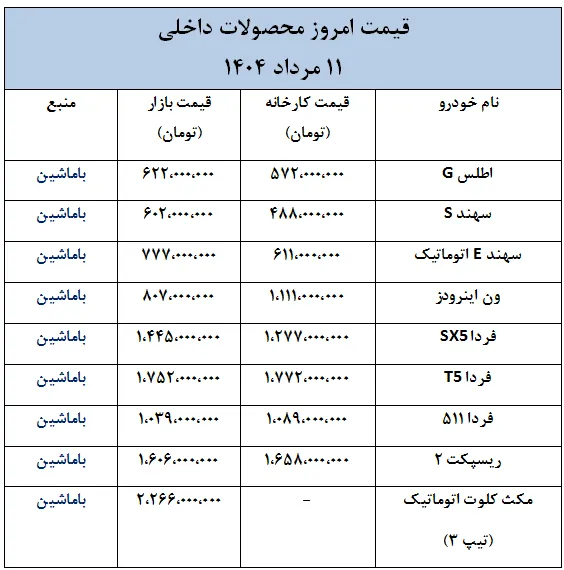 در ادامه، قیمت امروز خودروهای داخلی و خارجی به صورت جدول ارائه شده است.