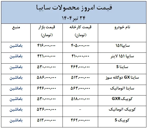 قیمت امروز خودروهای سایپا؛ رکود تورمی و تغییرات قیمت- 24 تیر 1404