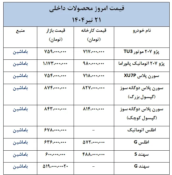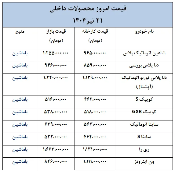 قیمت روز خودرو داخلی؛ جدیدترین تغییرات قیمتی بازار خودرو- 21 تیر 1404