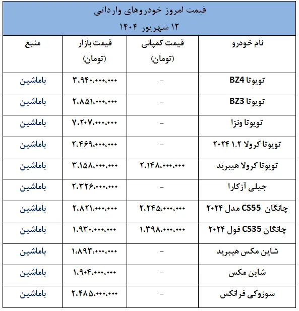 بر اساس گزارشهای امروز، چهارشنبه ۱۲ شهریور ۱۴۰۴، قیمتهای اعلامشده برای خودروهای وارداتی نشان میدهد که برخی برندها با افزایش قیمتهای قابل توجه و برخی دیگر با کاهش قیمتهای چشمگیر در بازار عرضه شدهاند.