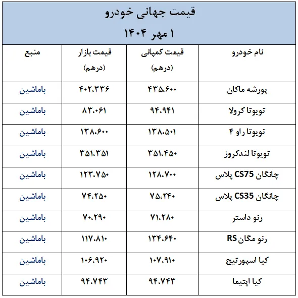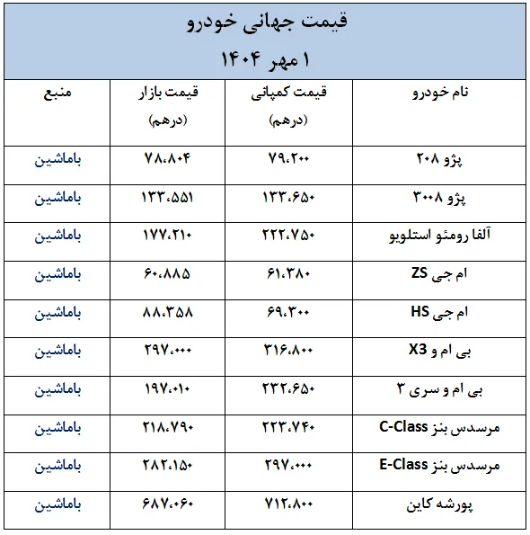 وضعیت قیمت خودروها در بازار جهانی+ جدول- 1 مهر 1404