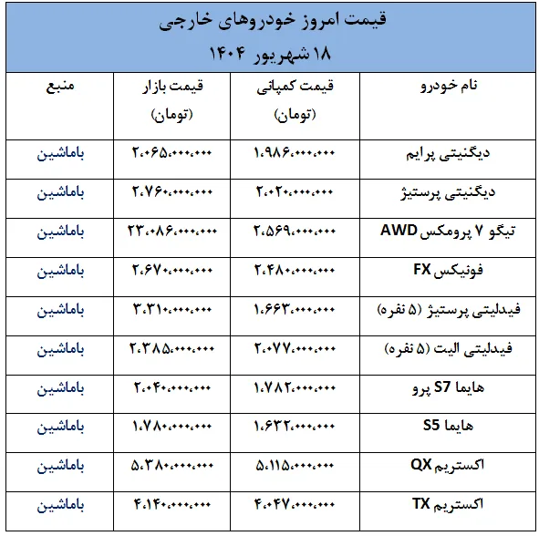 وضعیت قیمت ها در بازار خودروهای خارجی- 18 شهریور 1404