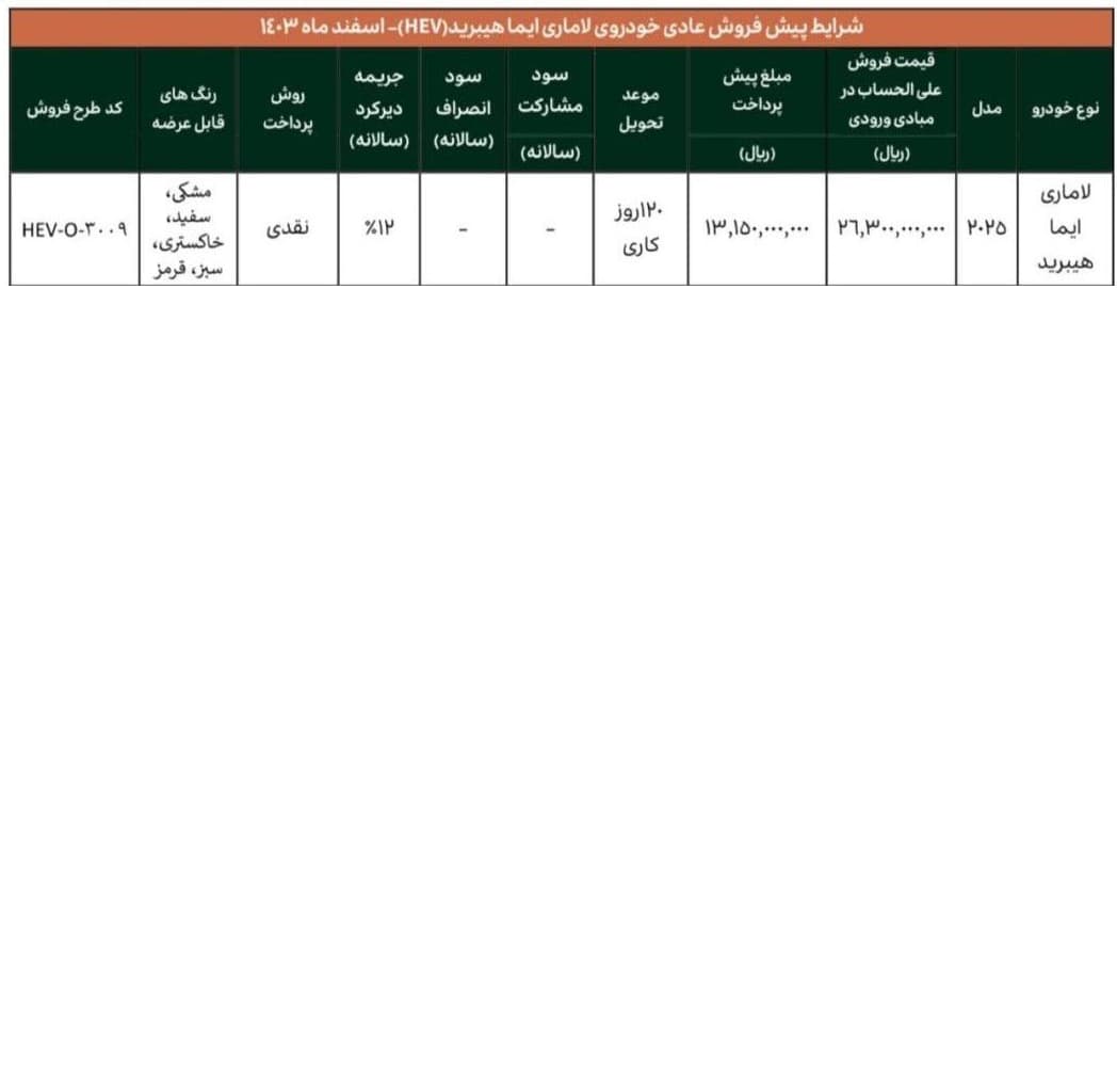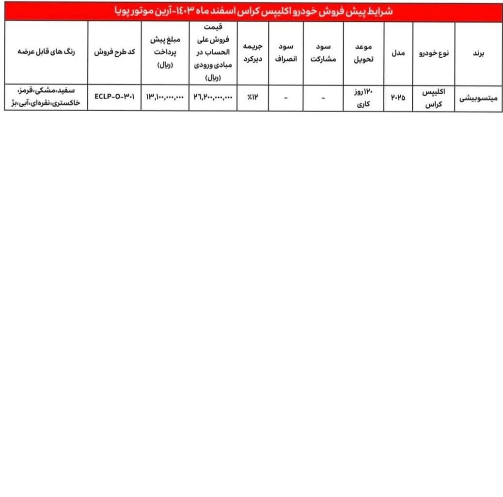 به گزارش باماشین، شرکت آرین پارس موتور به همراه آرین موتور پویا، در اطلاعیه ای رسمی، شرایط و ضوابط فروش خودروهای لاماری ایما هیبرید، میتسوبیشی اوتلندر و میتسوبیشی اکلیپس کراس را برای متقاضیانی که در سامانه خودروهای وارداتی ثبت نام کرده اند و در قرعه کشی مربوط به اسفند ماه 1403 به عنوان برنده اعلام شده اند، منتشر کرده است. بر اساس جزئیات اعلام شده، متقاضیان واجد شرایط می توانند از ساعت 16 روز شنبه 25 اسفند ماه 1403 با مراجعه به سایت فروش این شرکت نسبت به ثبت نام و واریز وجه اقدام نمایند.