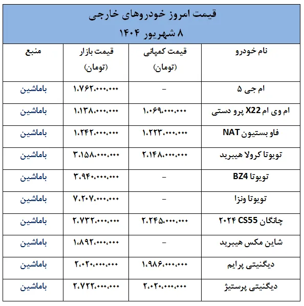 در ادامه، قیمت امروز خودروهای داخلی و خارجی در قالب جدول ارائه شده است.