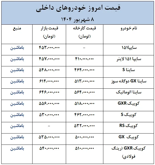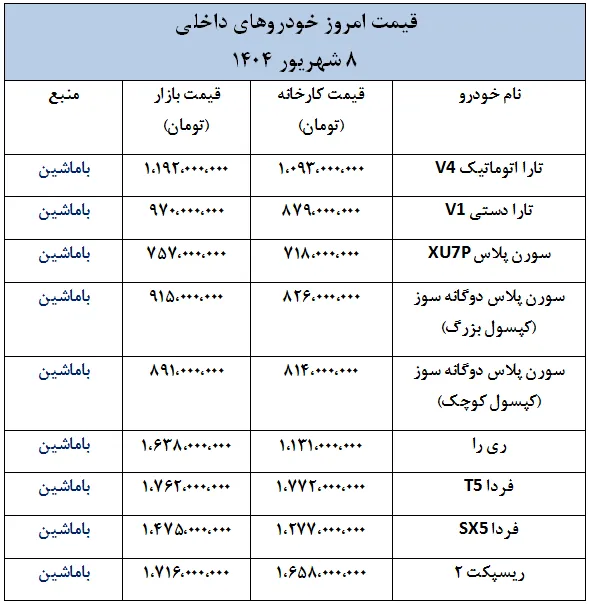 بر اساس گزارشهای اخیر، قیمت خودروهای داخلی امروز (8 شهریور 1404) از 453 میلیون تومان برای پراید 151 تا بیش از 1.7 میلیارد تومان برای برخی مدلهای مونتاژی و وارداتی متغیر است،