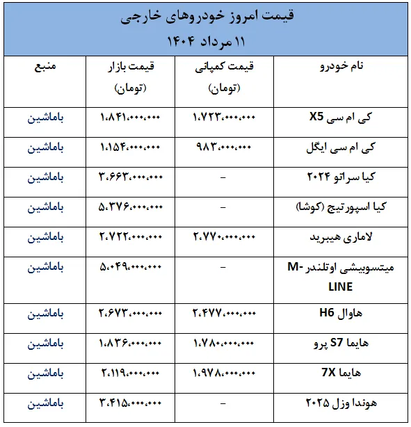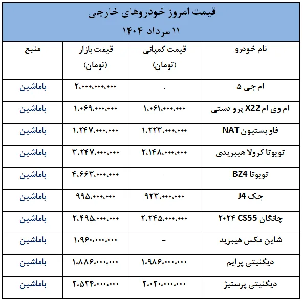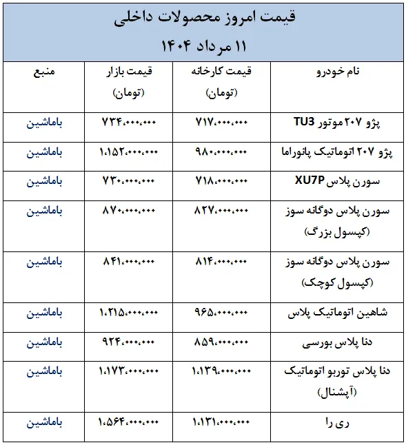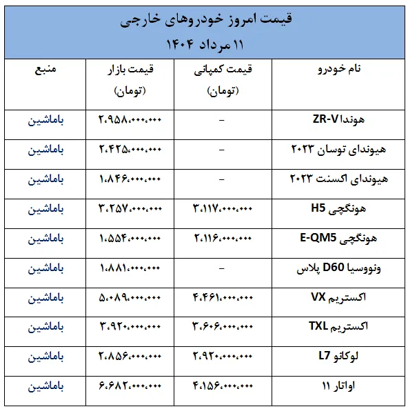 در ادامه، قیمت امروز خودروهای داخلی و خارجی به صورت جدول ارائه شده است.