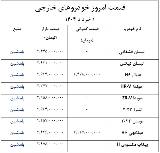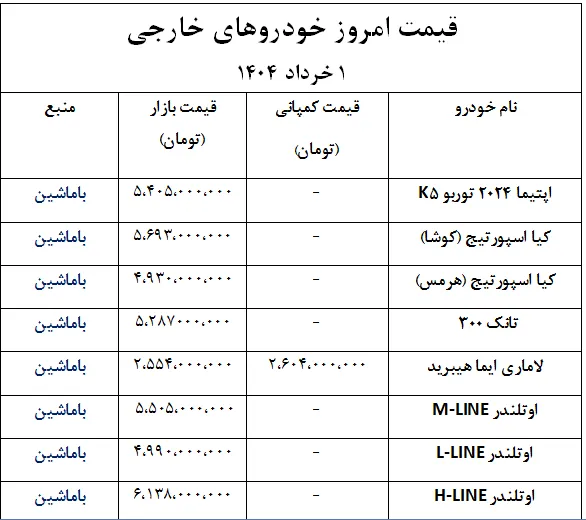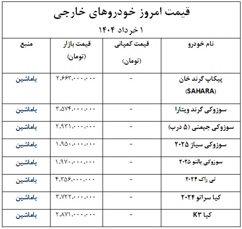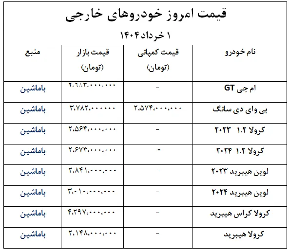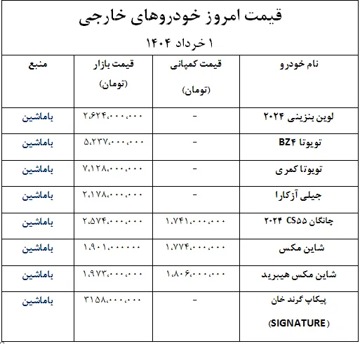 قیمت خودروهای خارجی امروز 1 خرداد 1404