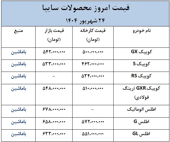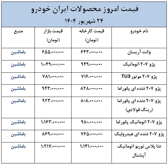 قیمت دنا پلاس، کوییک، ساینا و پژو 207- 24 شهریور 1404