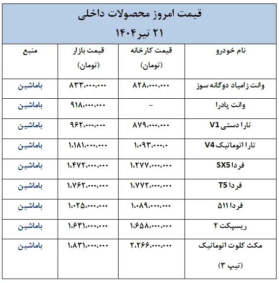 قیمت روز خودرو داخلی؛ جدیدترین تغییرات قیمتی بازار خودرو- 21 تیر 1404