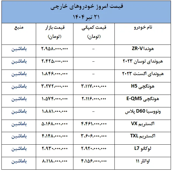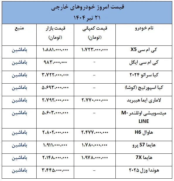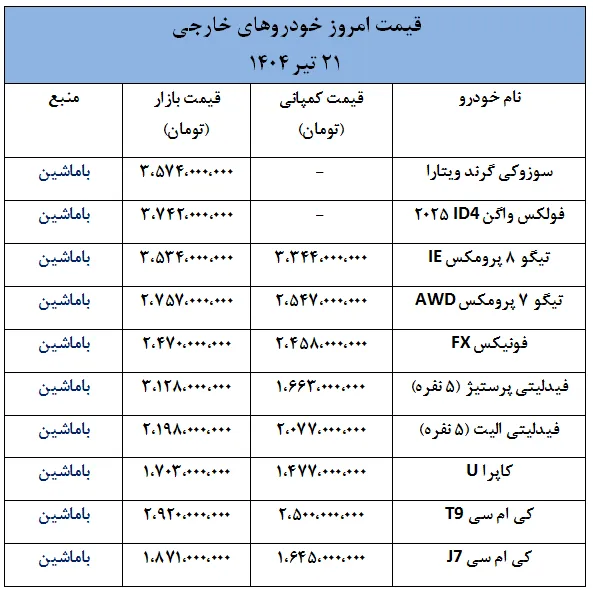 قیمت روز خودرو خارجی امروز 21 تیر 1404
