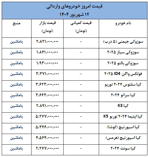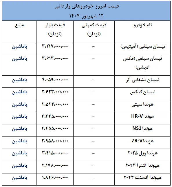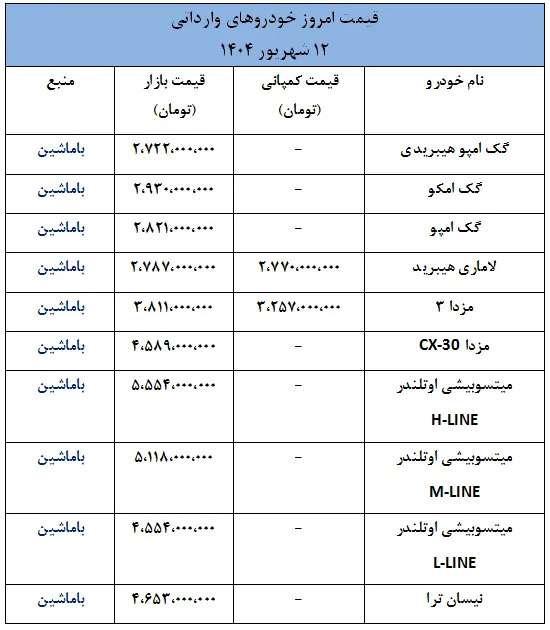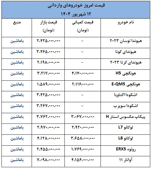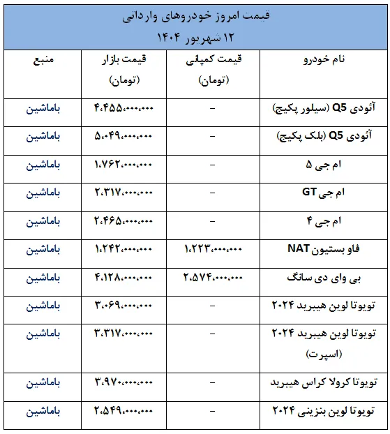 بر اساس گزارشهای امروز، چهارشنبه ۱۲ شهریور ۱۴۰۴، قیمتهای اعلامشده برای خودروهای وارداتی نشان میدهد که برخی برندها با افزایش قیمتهای قابل توجه و برخی دیگر با کاهش قیمتهای چشمگیر در بازار عرضه شدهاند.