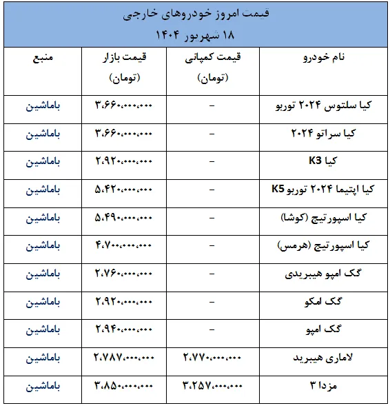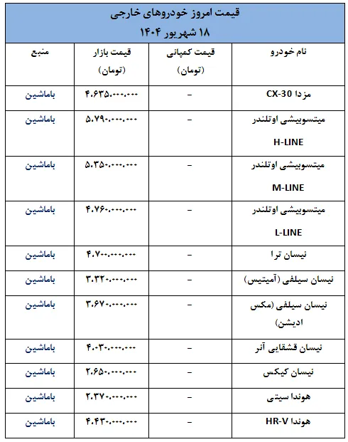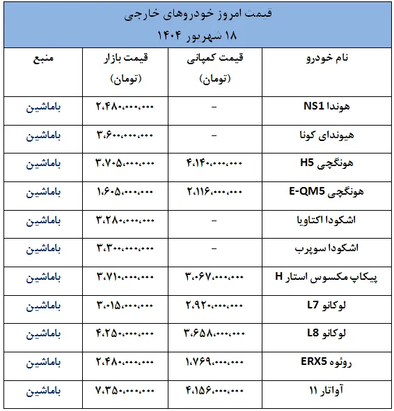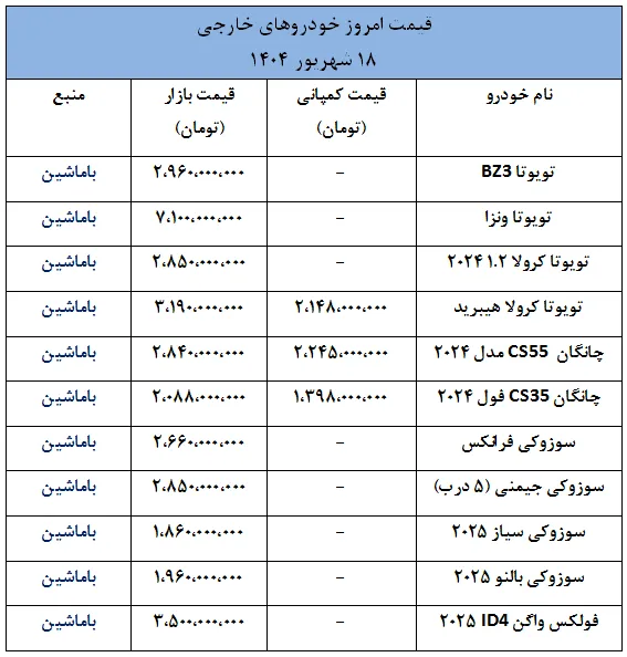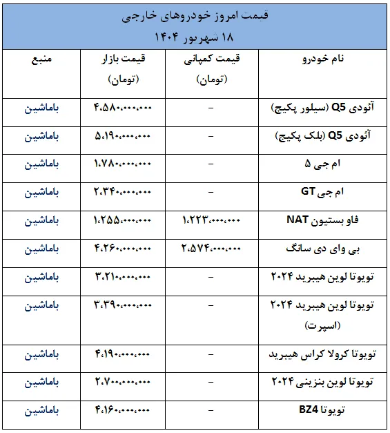 وضعیت قیمت ها در بازار خودروهای خارجی- 18 شهریور 1404